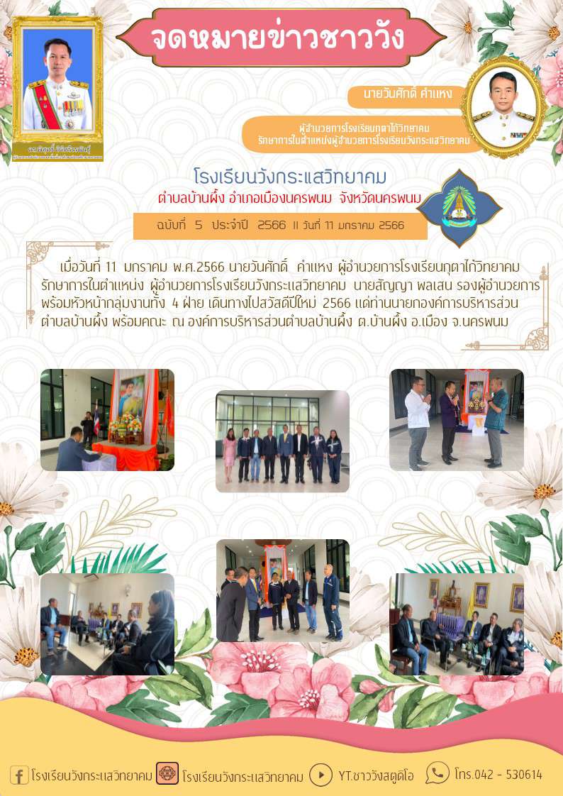นายวันศักดิ์ คำแหง ผู้อำนวยการโรงเรียนกุตาไก้วิทยาคม รักษาการในตำแหน่ง ผู้อำนวยการโรงเรียนวังกระแสวิทยาคม นายสัญญา พลเสน รองผู้อำนวยการ พร้อมหัวหน้ากลุ่มงานทั้ง 4 ฝ่าย เดินทางไปสวัสดีปีใหม่ 2566 แด่ท